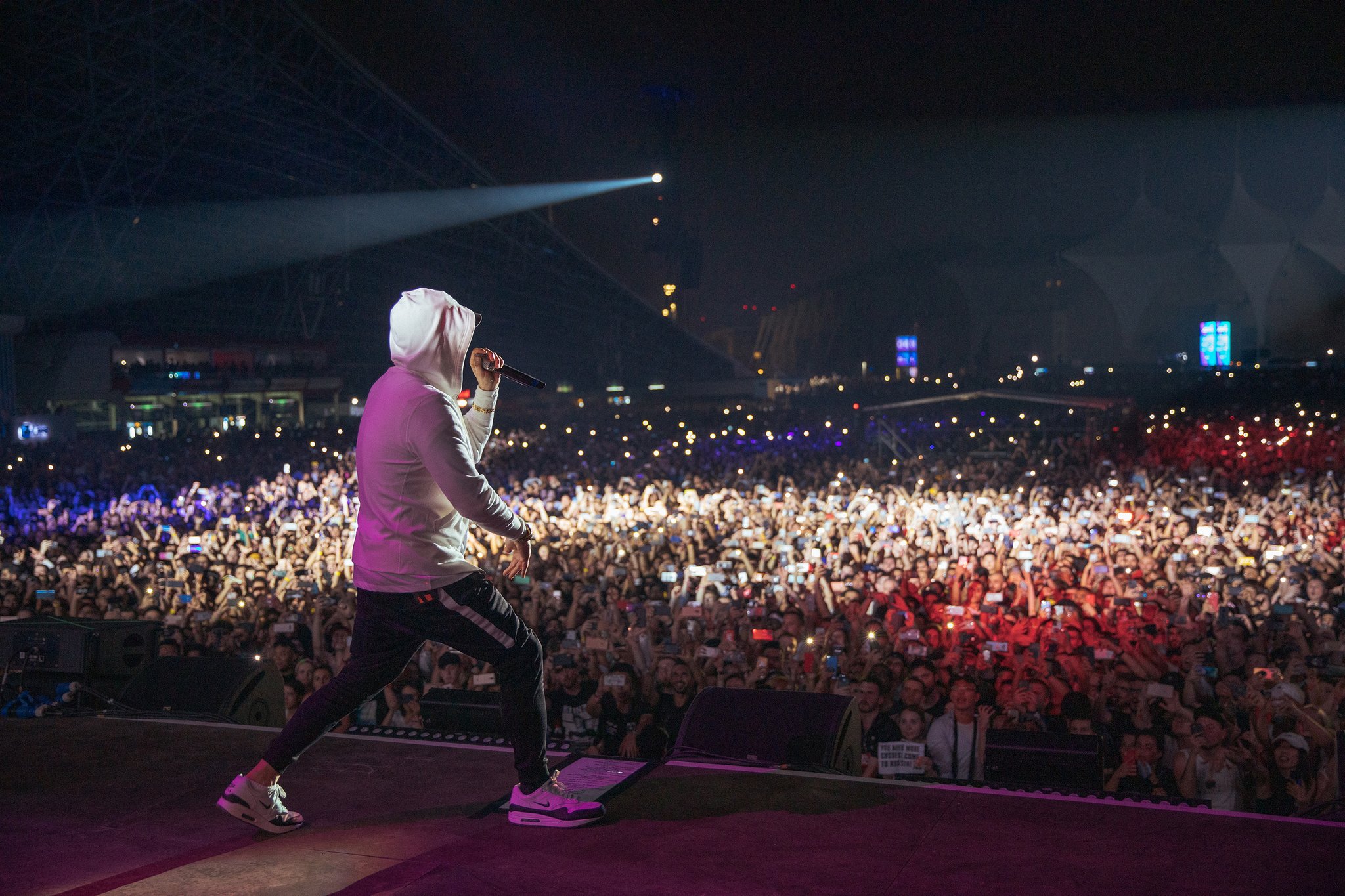 “Alguns fãs do Eminem tiveram um atraso na entrada no show desta noite no du Arena, que era para garantir a saúde e a segurança dos fãs entrando no local. Obrigado por sua paciência e cooperação,” dizia o Tweet.
