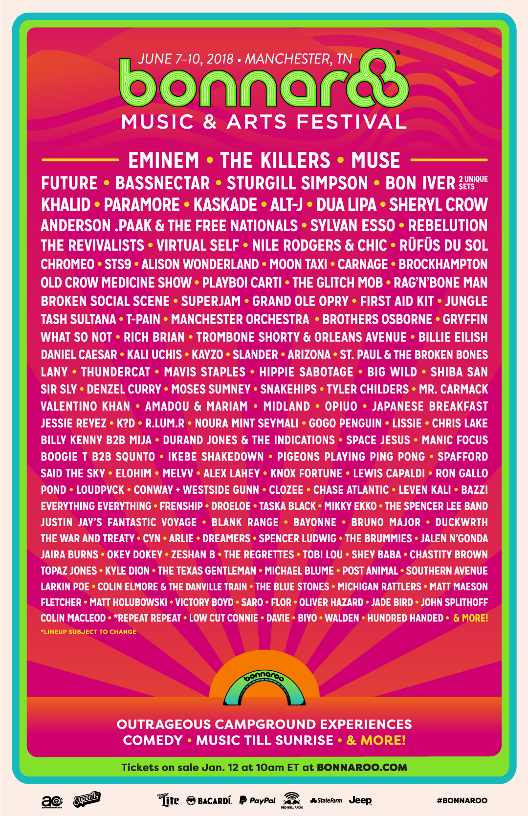 Eminem, The Killers e Muse são todos headliners do Bonnaroo deste ano, programado para retornar à “Fazenda” em Manchester, Tennessee nos Estados Unidos, de 7 a 10 de junho. Isso marca a volta do Eminem ao festival depois de seu show no dia 11 de junho de 2011.