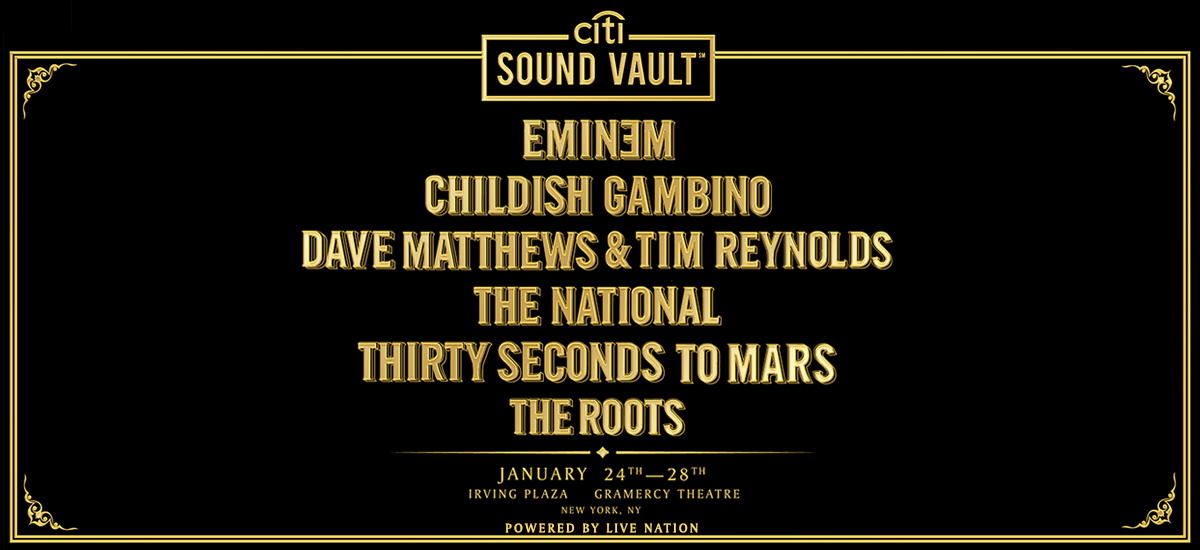 Citi e Live Nation anunciaram ontem que a série “Citi Sound Vault” irá contar novamente com shows exclusivos para os clientes do cartão Citi durante a semana do Grammy. Eminem, Childish Gambino, Thirty Seconds To Mars, The National e Dave Matthews (com o seu guitarrista de longa data Tim Reynolds) todos serão headliners nos shows que serão realizados no Irving Plaza em New York durante a semana do Grammy, do dia 24 a 28 de janeiro. A programação completa está abaixo.