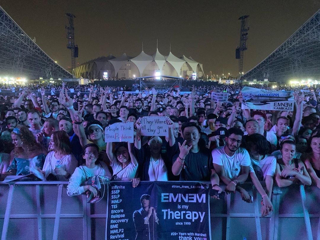O rapper, compositor, ator e produtor musical americano Eminem retornou aos Emirados Árabes Unidos para um show esgotado na noite de sexta-feira (25 de outubro) no du Arena, em Abu Dhabi. A sua última visita no país havia sido em 2012 para o seu show no Formula 1 Festival.